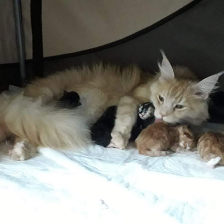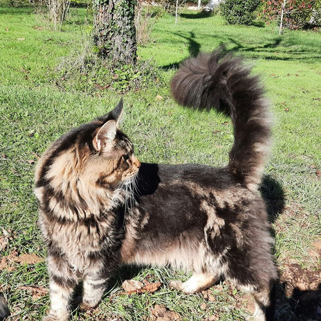 Je suis tombée amoureuse de cette race il y a 6 ans, le Maine Coon, ce « TENDRE GÉANT » au cœur d ‘or. J’accorde beaucoup de temps à mes félins et ils me le rendent bien.